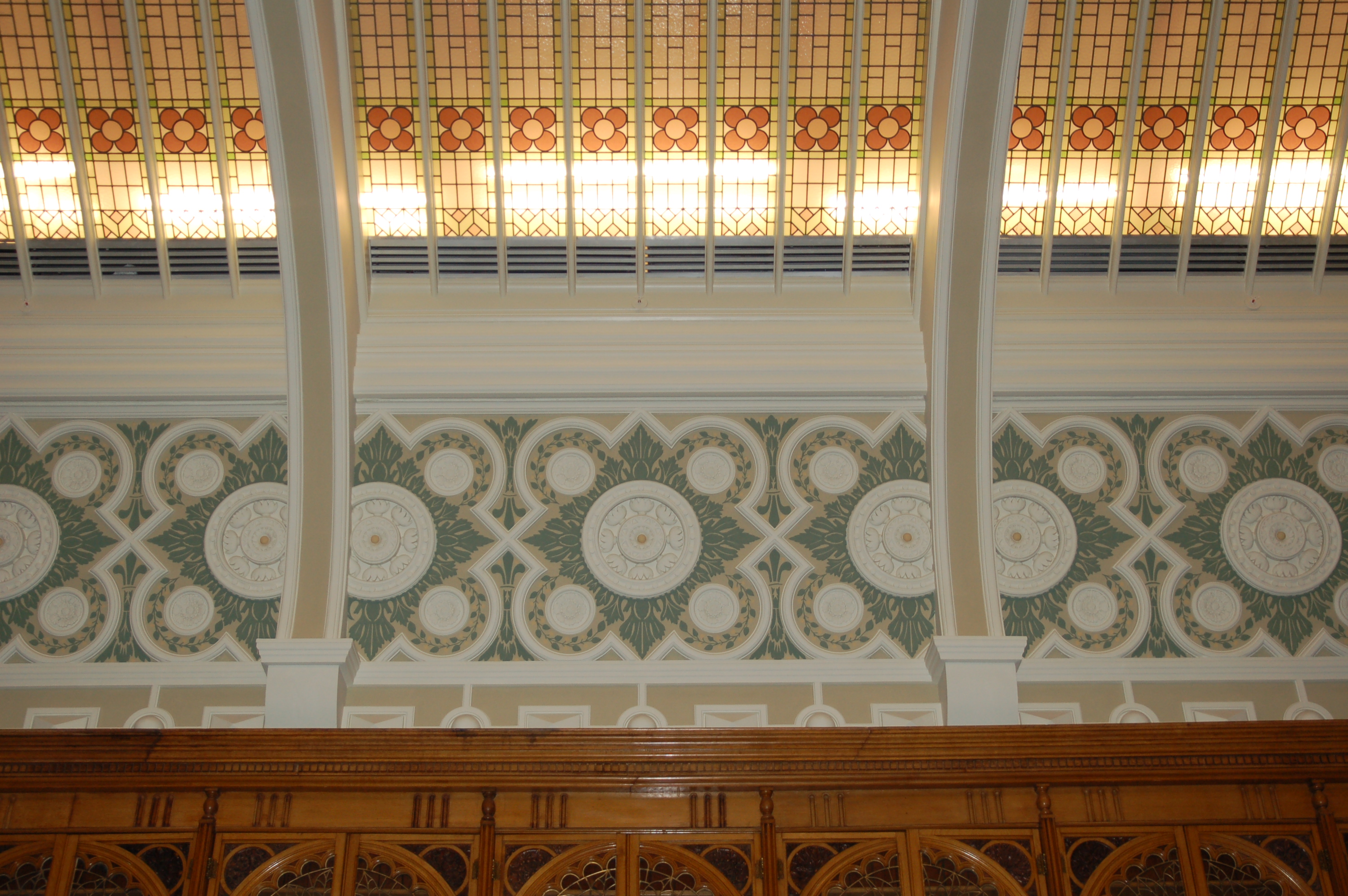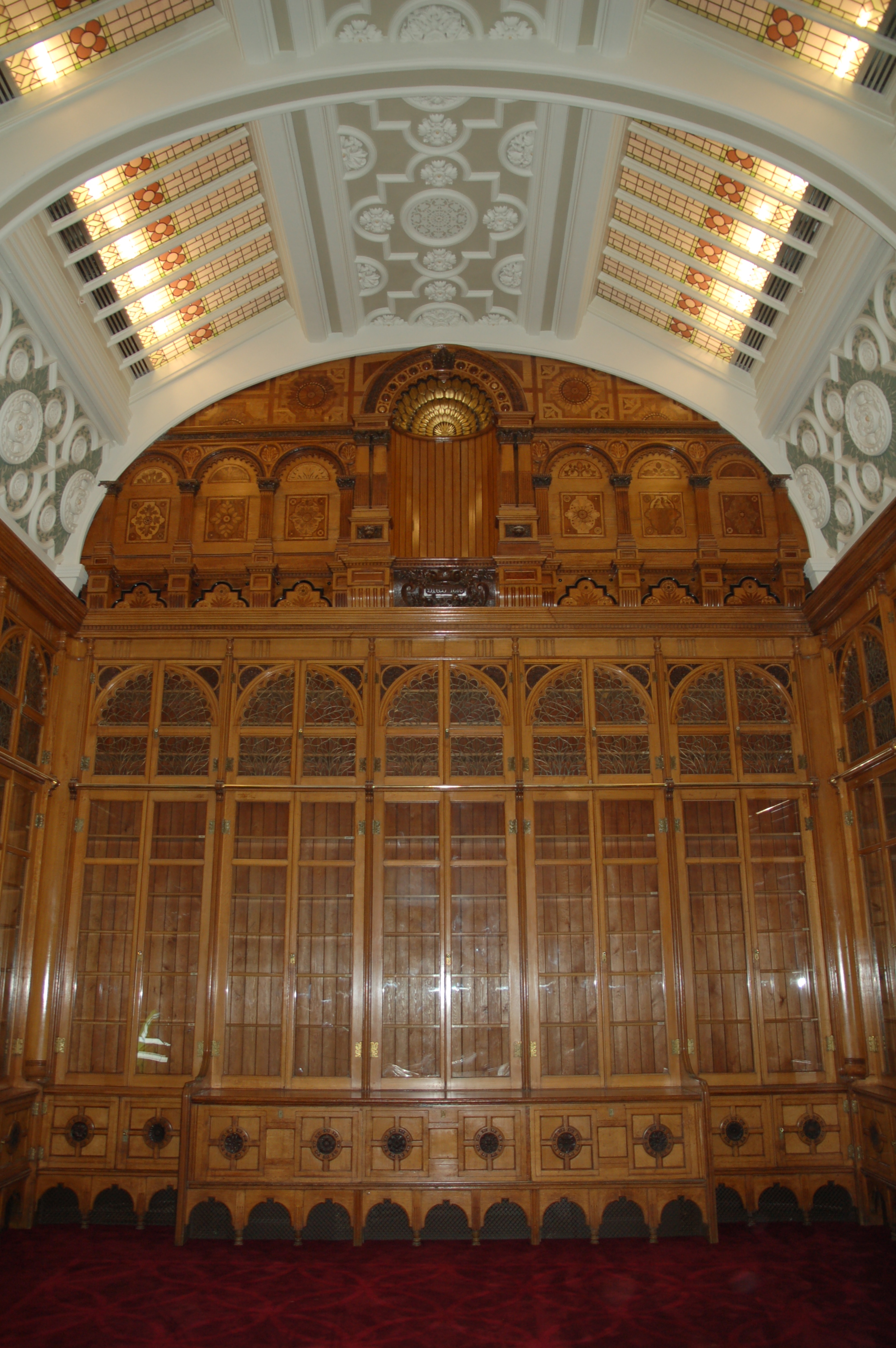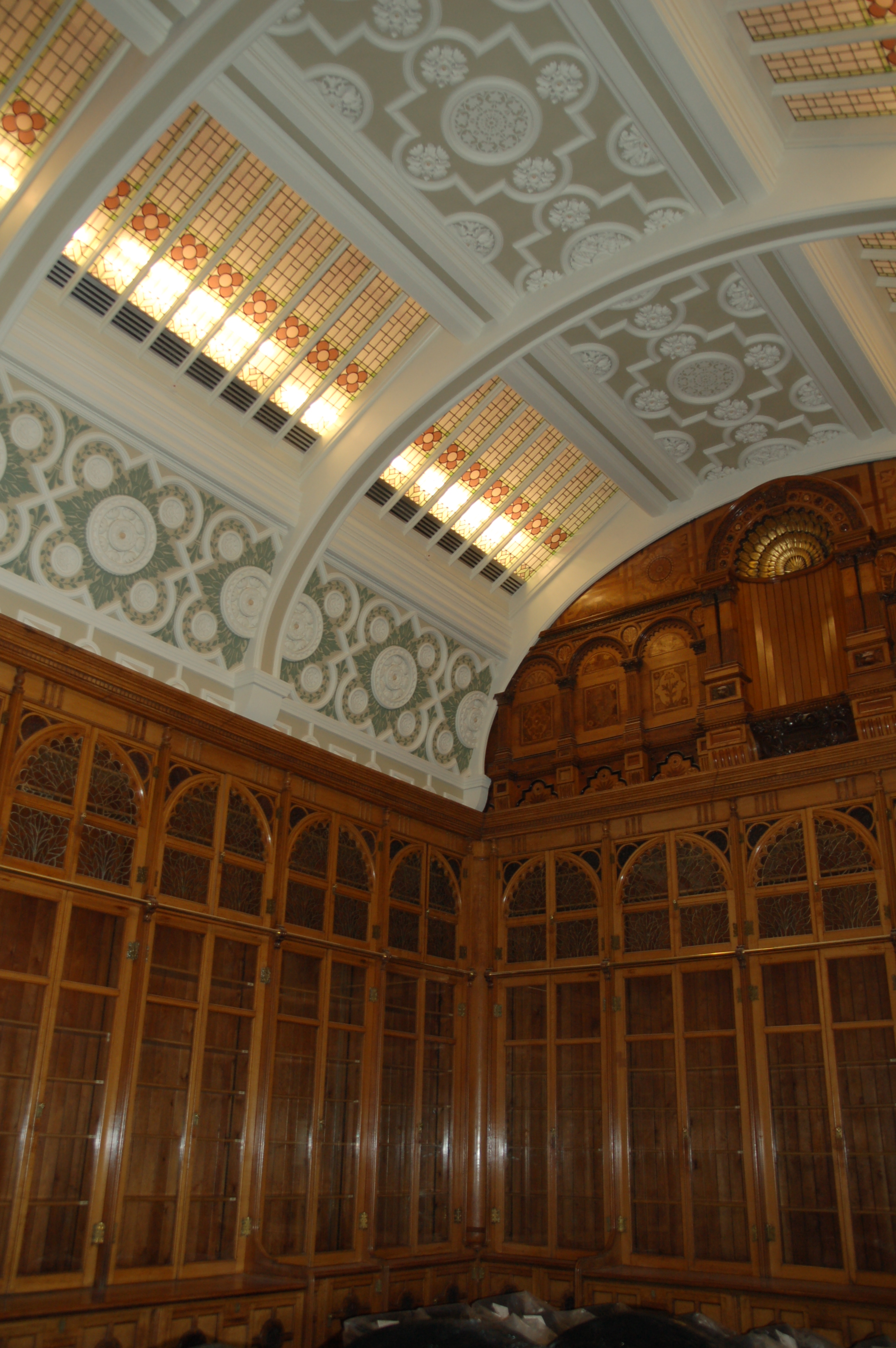 Value £200KAs part of the relocation of Birmingham Library the existing showcases and ceiling lights were carefully dismantled and delicately refurbished. We created a new room on the top floor of the new library included the curved ceiling. New plaster cornices and mouldings were created based on the original and decorative stencilling was carried out before the refurbished cases were reassembled in position.