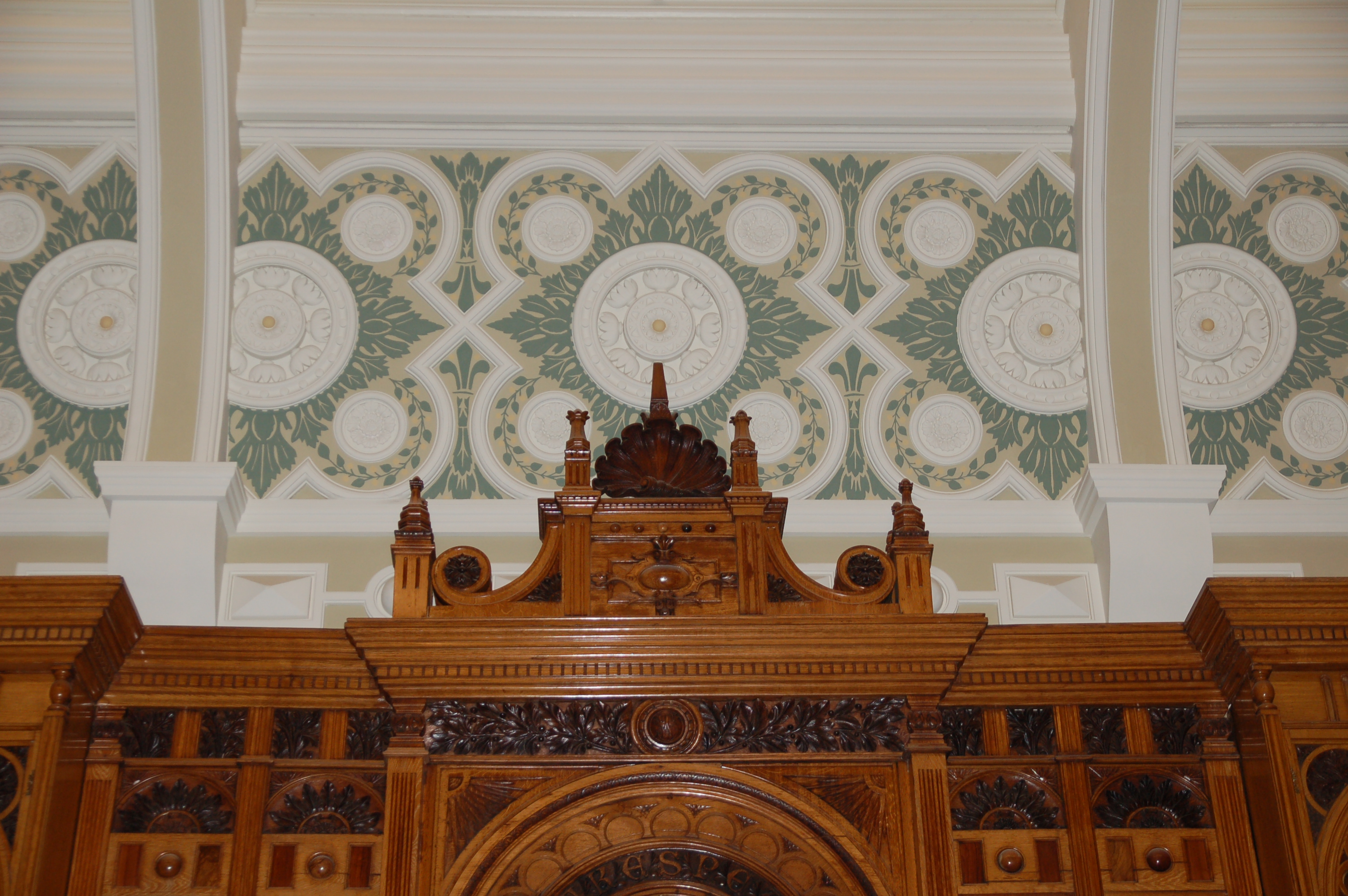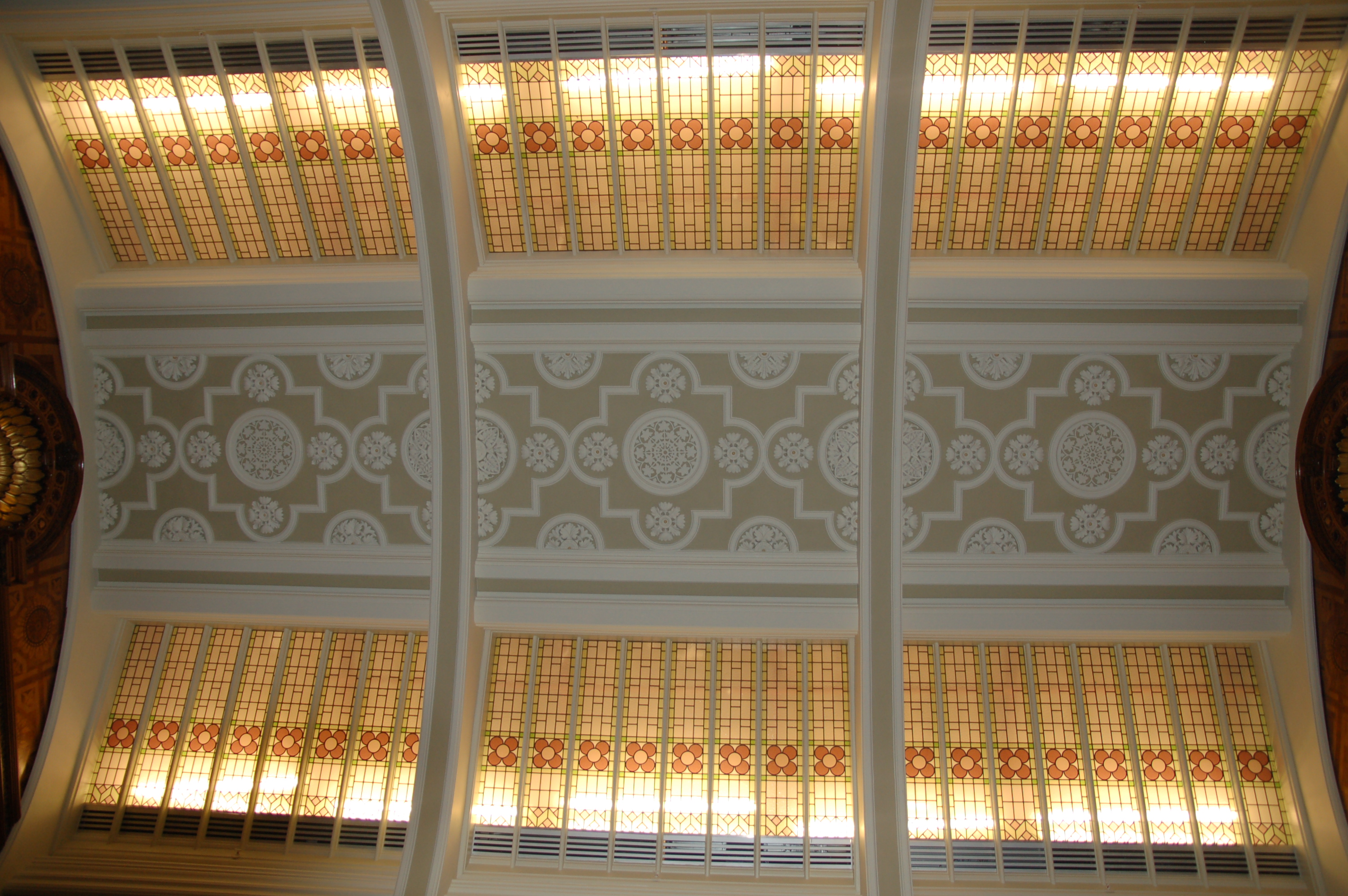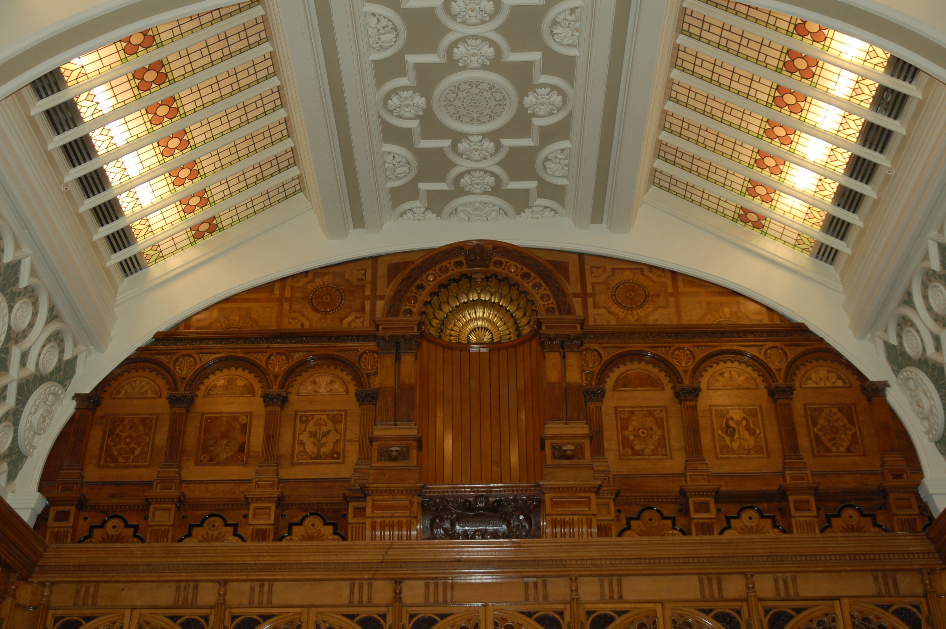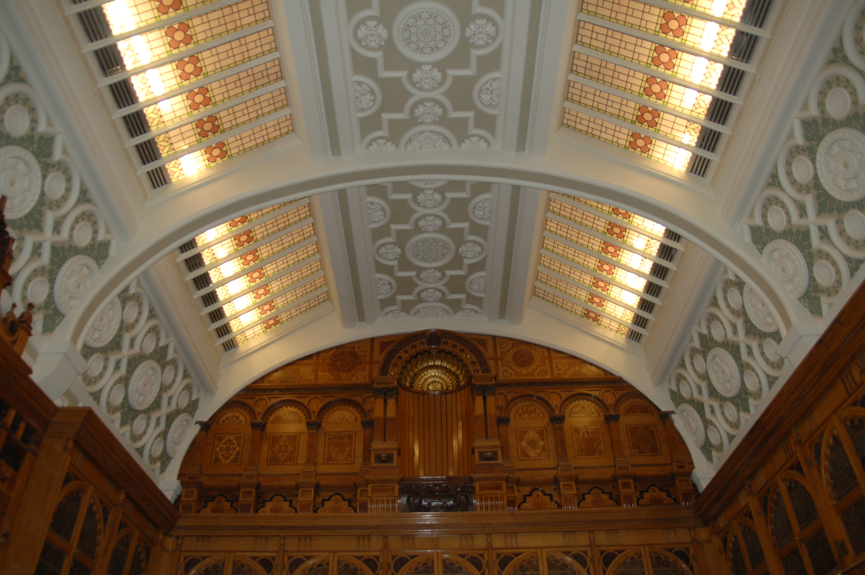 Value £200KAs part of the relocation of Birmingham Library the existing showcases and ceiling lights were carefully dismantled and delicately refurbished. We created a new room on the top floor of the new library included the curved ceiling. New plaster cornices and mouldings were created based on the original and decorative stencilling was carried out before the refurbished cases were reassembled in position.