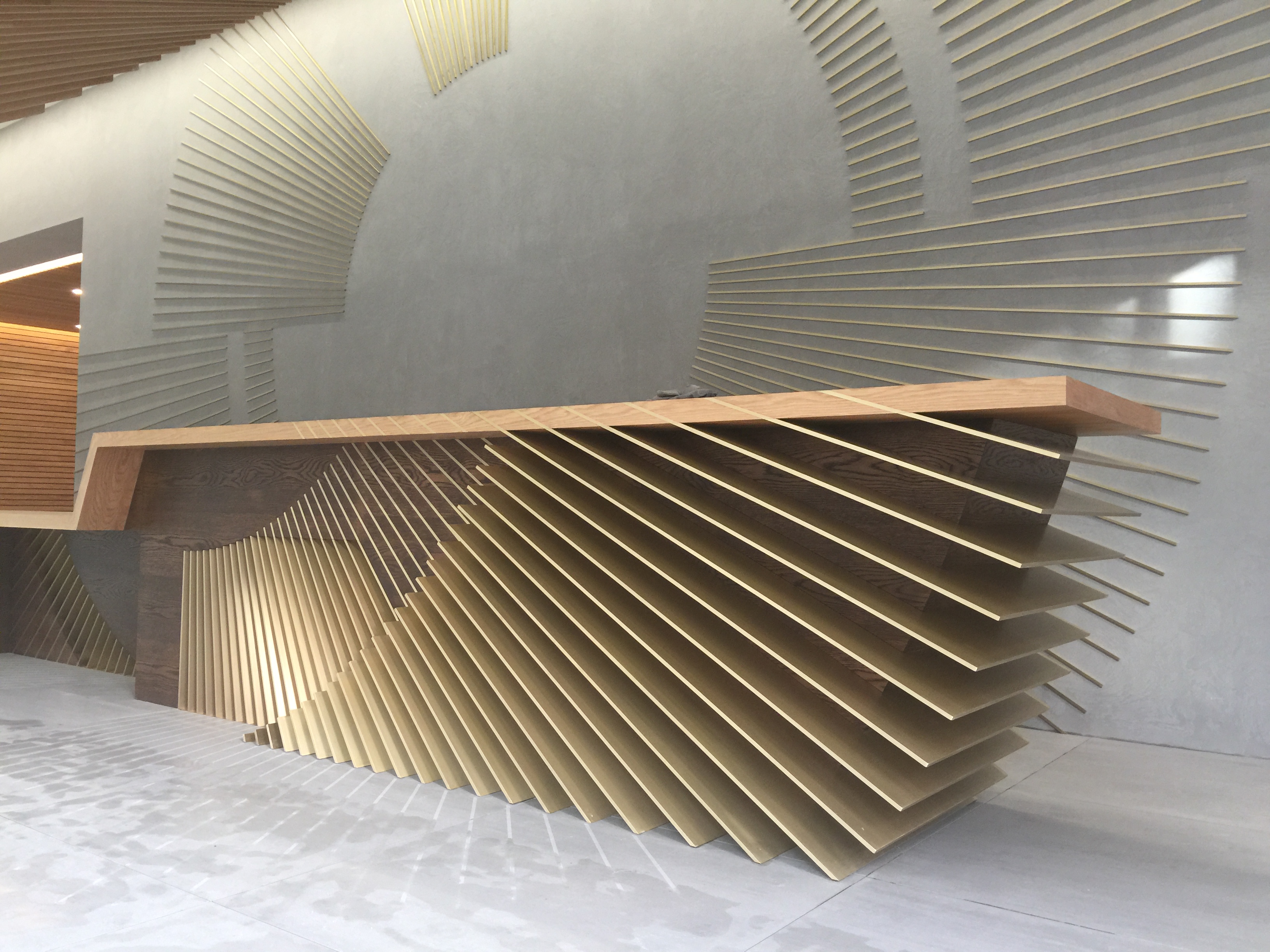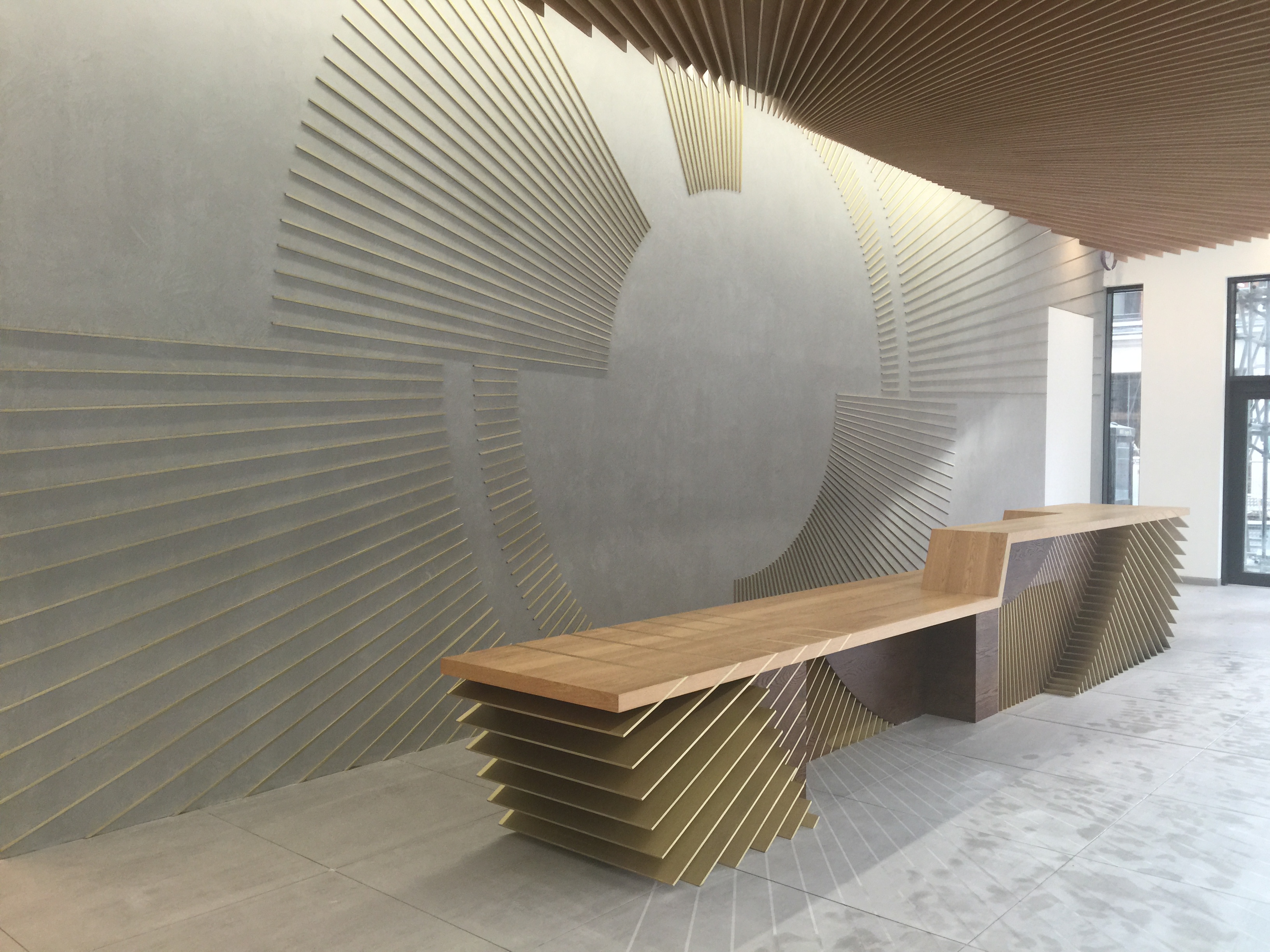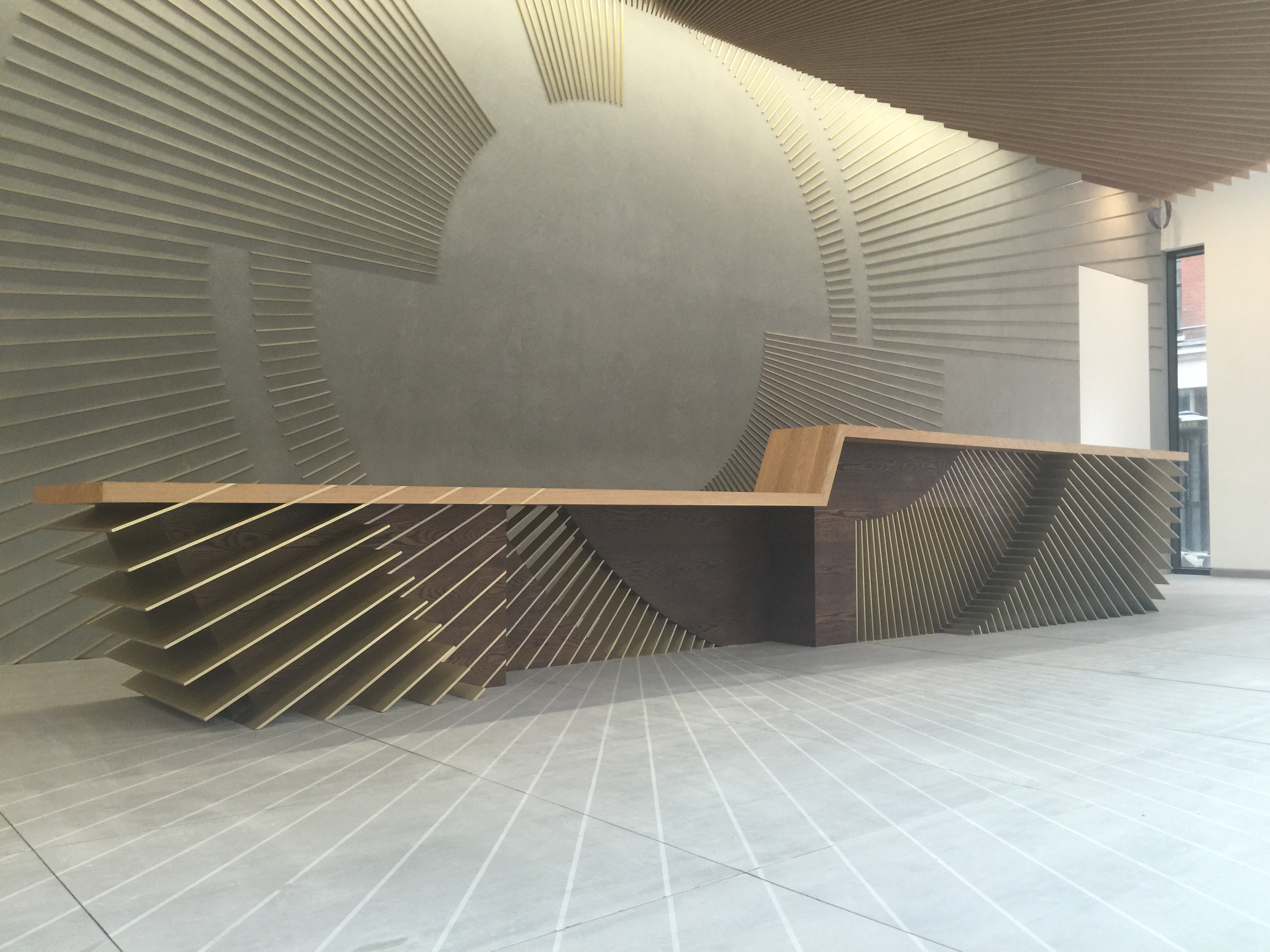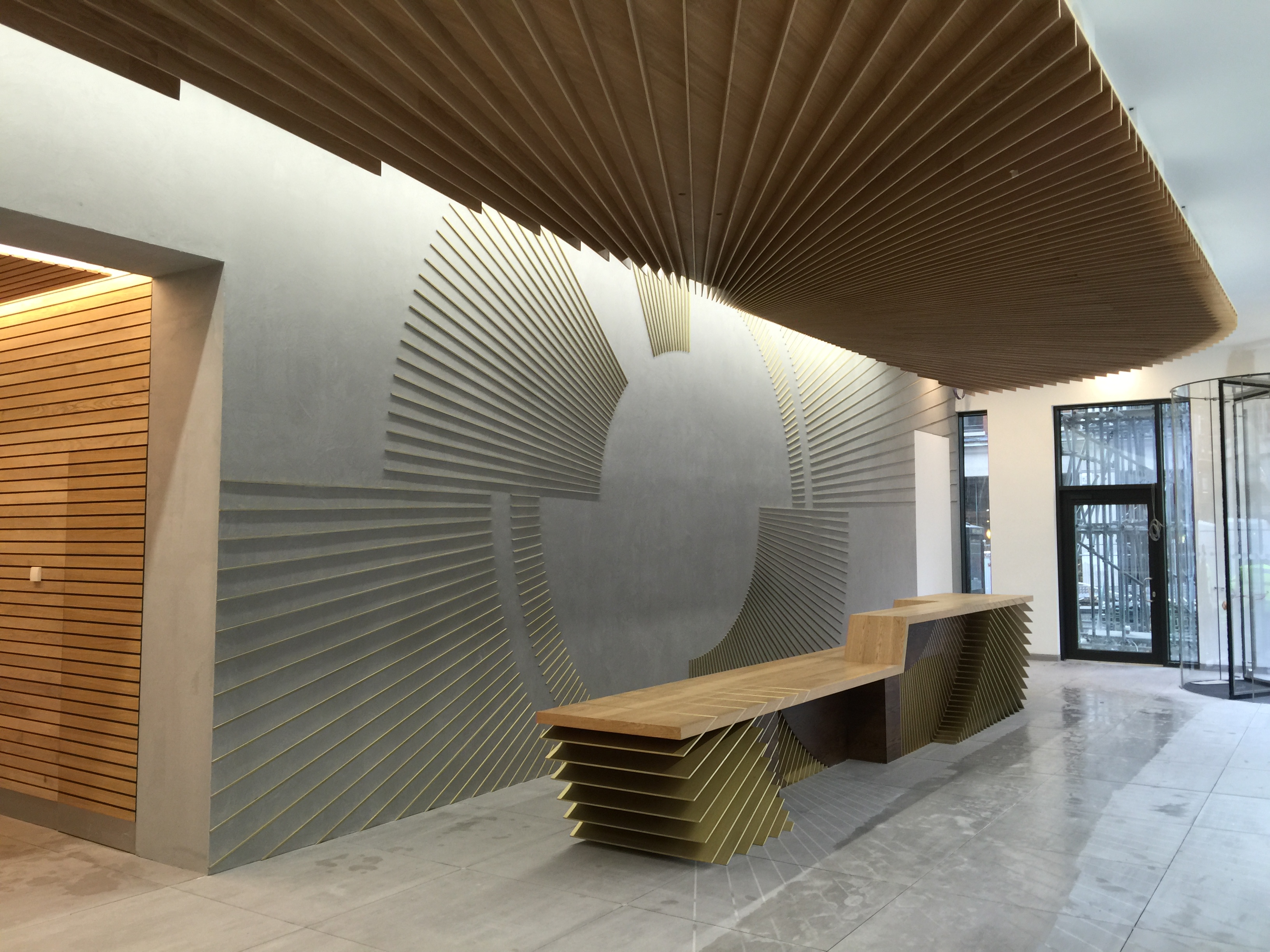 Value £500KCompletion of “living staircase” and bespoke reception area. The desk was formed from solid brass bars to wall and desk itself all generated from a single setting out point on the wall. The staircase is an expanded helix with solid oak treads, stringers and soffits over 3 floors.