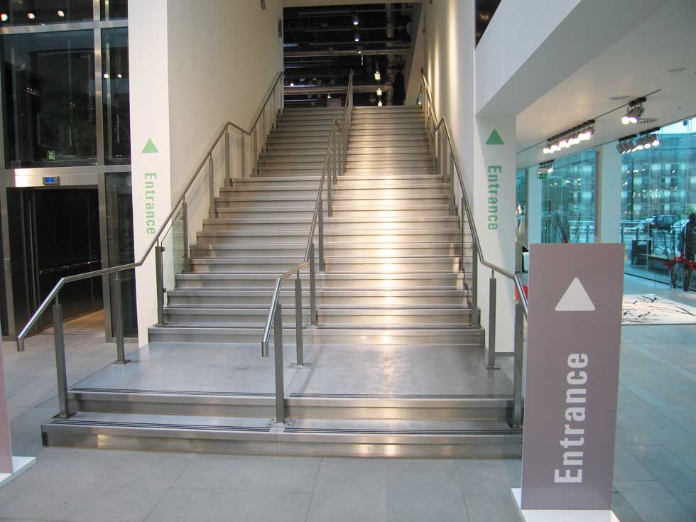 Specialist stainless steel works including entrance pods, bespoke staircases (both straight and spiral), balustrades and wall panelling. Winner of the 2007 NAS Design Award. Work completed at Manchester and Thurrock.
