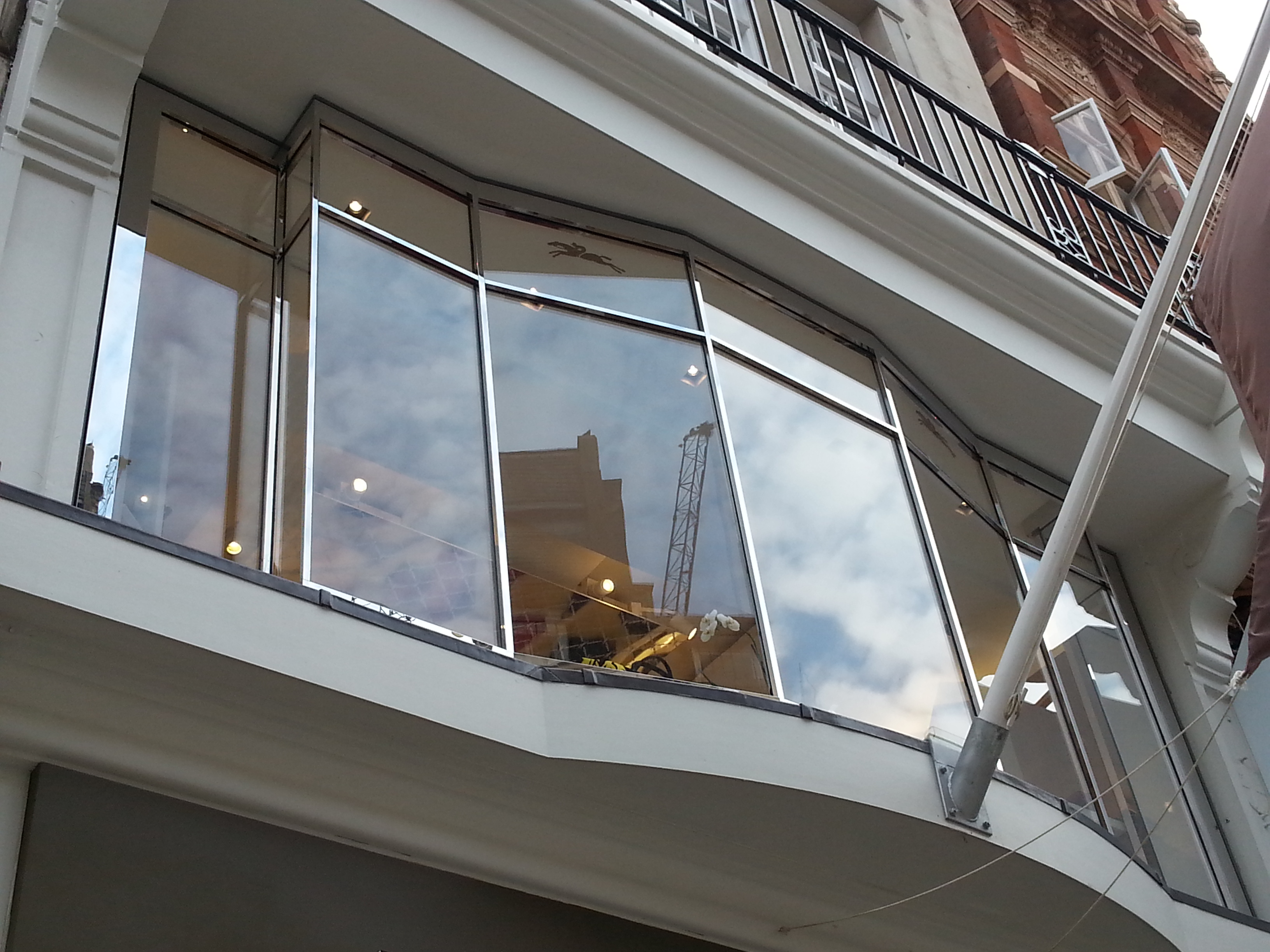 Supply and installation of mirror polished stainless steel shopfront and projecting bay window.